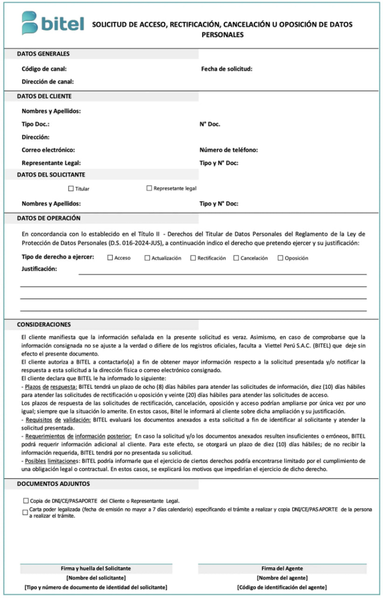 Bitel recopila sus datos personales en cumplimiento de las disposiciones de la Ley de Protección de Datos Personales - Ley No. 29733 y su Reglamento (aprobado mediante Decreto Supremo Nº 016-2024-JUS). Así, se obliga a: